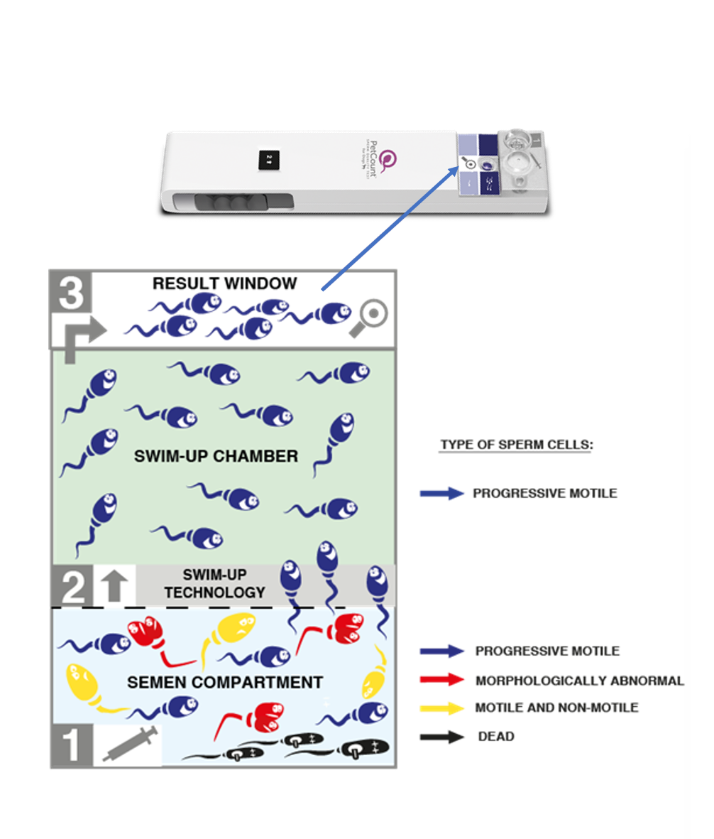 The PetCount device makes it possible to separate all the good swimmers, the Progressive Motile Sperm Cells (PMSCs) from the rest of the sperm population which include dead sperm cells, morphological abnormal sperm cells and motile but not the PMSCs.